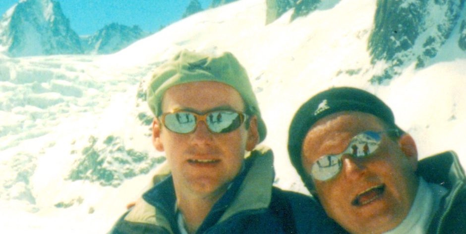 Picture shows ashen-faced author (left) and the muppet-faced John Young (RIP John) after surviving the Vallee Blanche, Chamonix in 1998.